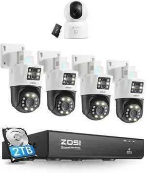 ZOSI C298 4K Dual-Lens PoE Security Camera System with 2TB HDD, 4 x 8MP Pan/Tilt (2x4MP) PoE 360 Camera Outdoor, C518 4K Indoor Security Camera, WiFi Pan/Tilt Pet/Dog/Baby Plug-in IP Camera