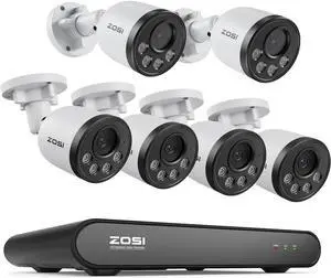 ZOSI 5MP PoE Security Camera System: 8CH H.265+ NVR (No Hard Drive) with 4X 4MP Audio Cameras + 2X 4MP Add-on Cameras, Smart Person/Vehicle Detection, 100ft Night Vision, IP66 Weatherproof.