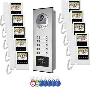 Video Intercom System for Apartment,4.3 inch Monitor Wired Video Door Kit,Indoor Outdoor Video Intercom System, Doorphone Telephone Style, ID Card Unlocking (1 Doorbell + 10 Monitor)