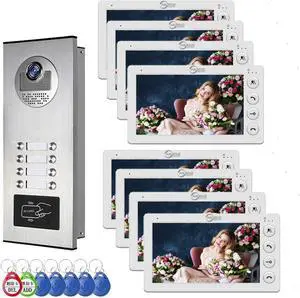 Video Apartment Intercom System,6 Units 7 inch Monitor Wired Video Door Phone Kit,Indoor Outdoor Video Doorbell,ID Keyfobs Unlock,2 Way Audio,6-Screen for Home Apartment (1 Doorbell+8 Monitor)