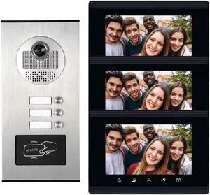 Upgrade Versions 3 Units Apartment Intercom System 7 inch Touch Monitor Video Door Phone Kits Support Ethernet Cable Connect, Single-Supply, ID Keyfobs Unlock for Home Apartment