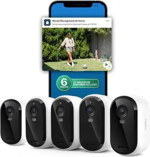 Arlo Essential Security Camera 2K (3rd Gen, 2025 Release) 5 Cam + 6 Months of Secure Plus Plan - Wireless Outdoor Camera, Battery Power, Person Recognition, Package Detection, Animated Preview, White