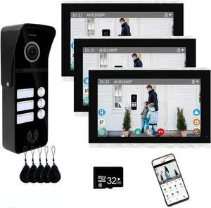 Wired Apartment Video Doorbell System 3 Units 10 Inch Touch Screen Monitor, Wireless Video Door Phone Kit,Indoor Outdoor Support Monitoring,IC Card Unlocking,Dual Way Intercom for Home Villa