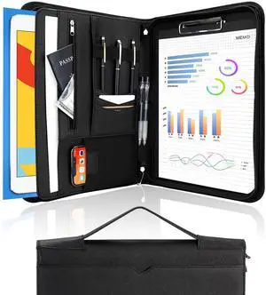 Portfolio Business Padfolio Folder with Zipper, Conference Meeting Executive File Legal Document Organizer with Pockets Letter Size A4 Writing Pad Notepad Padfolio -Black