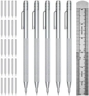 5-Pack Tungsten Carbide Scriber, Metal Scribe Tool with 25 Replacement Marking Tips & Steel Ruler - Knurled Aluminum Handle & Magnet, Engraving Pen for Glass/Ceramics/Metal Sheet (5)