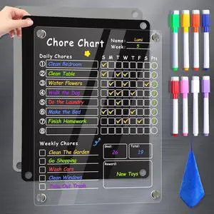 Magnetic Chore Chart for Adults & Teens & Kids on Fridge 12"x9.5" Acrylic Dry Erase Chore Board with Daily, Weekly & Notes Sections Includes 8 Fine Point Markers & Towel