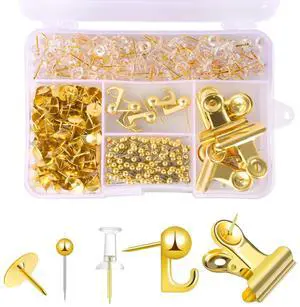 310 Pcs Gold Push Pins Set Thumb Tacks Decorative Push Pins for Cork Board with Push Pin Hook Pushpin Clip 5 Style Office Accessories for Cork Board Map Office (Gold)