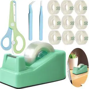 Desktop Tape Dispenser Kits with Weighted Nonskid Base Tape Dispenser- Includes 9 Rolls of Transparent Tape(0.71 Inch x 500 inches Each) & Blue Scissors, 2 Pcs Tweezers (Green)