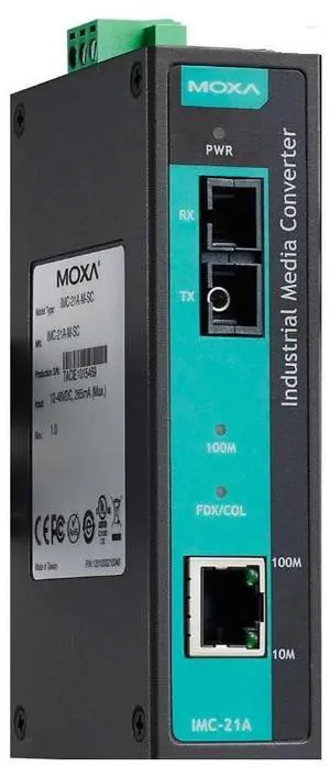 MOXA IMC-21A-S-SC-T Industrial 10/100BaseTX to 100BaseFX Media Converter, Single Mode, SC Connector, -40 to 75 °C.
