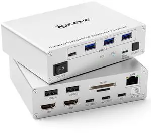 KCEVE 15-in-1 KVM Switch USB C Docking Station, USB 3.0 KVM Switch 2 Monitors 2 Laptops HDMI 4K@60Hz, 80W PD, 5Gbps, MST, Gigabit Ethernet, SD/TF Card, Power Adapter, Wired Remote