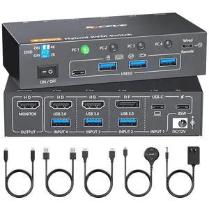 KCEVE 4K KVM Switch 1 Monitors 4 Computers USB-C HDMI DP, EDID Emulator USB 3.0 KVM Switch 4 Port 4K@60Hz for 4 Computer Share Keyboard Mouse and 1 HDMI Monitor, with Power Adapter and Wired Remote