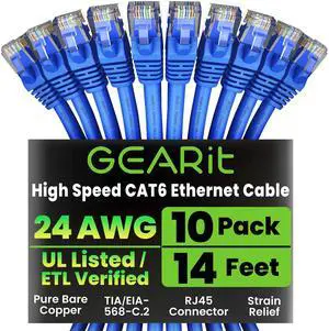 GEARit Cat 6 Ethernet Cable Pack - 10-Pack 14 ft Cat6 Ethernet Patch Cables ^^ RJ45 Network Patch Cable, 10 Gbps Snagless Gold-Plated Connectors - Ethernet Cable Cat 6 for PC, TV, Router - Blue