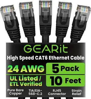 GEARit Cat 6 Ethernet Cable Pack - 5-Pack 10 ft Cat6 Ethernet Patch Cables ^^ RJ45 Network Patch Cable, 10 Gbps Snagless Gold-Plated Connectors - Ethernet Cable Cat 6 for PC, TV, Router - Black
