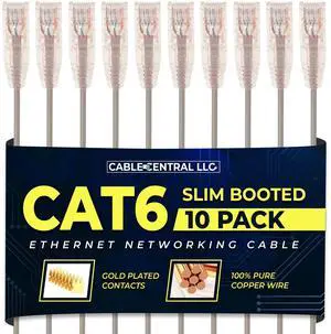 Slim Cat6 Ethernet Networking Patch Cable, 7 Feet, Gray, 10 Pack, 10 Gbps Speed, RJ45 Connector M/M Pure Copper Internet Wire, Gold Plated Contacts