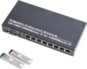 Gigabit SFP Media Converter - 2 SFP to 8 RJ45 Transceiver, 10/100/1000M Fiber Optic Switch with 3KM/20KM LC/SC SFP Module (1PCS & LC 20KM Kit)