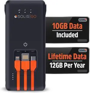 SIMO Solis Go 4G Mobile Hotspot WiFi Power Bank with Built-in Cables for Travel in 140+ Countries, No SIM Card or Contract, Multi-Carrier Network, 20 Devices, 1GB/Month Lifetime + 10GB Global Data