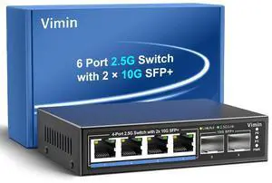 6 Port 2.5G Unmanaged Network Switch, VIMIN 4X 2.5Gbase-T Ports, 2X 10G SFP+ Port, 60Gbps Switching Capacity, IEEE802.3, Metal Housing, Fanless, Work for 2.5Gbps NAS, Wireless AP & PC