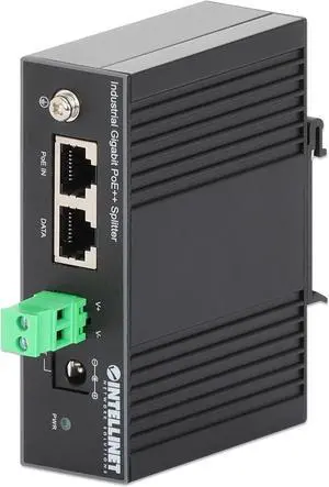 Intellinet Industrial PoE++ Splitter 60W Input, Two 12V DC Output via 2-Pin Terminal Block or DC Jack, IP30-Rated Metal Housing, DIN Rail Mount 508940
