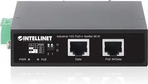 Intellinet Industrial PoE++ Splitter 60W Input, Two 12V DC Output via 2-Pin Terminal Block or DC Jack, IP30-Rated Metal Housing, DIN Rail Mount, 3 Yr Mfg Warranty 508940