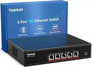 YuanLey 5 Port 10G Ethernet Switch, 5 x 10Gbps RJ45 Ports, Support 10G/5G/2.5G/1G/100Mbps Speed Auto-Negotiation, 100Gbps Switching Capacity, Unmanaged Switch Rackmountable, Plug and Play