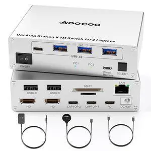 KCEVE 15-in-1 KVM Switch USB C Docking Station, USB 3.0 KVM Switch 2 Monitors 2 Laptops HDMI 4K@60Hz, 80W PD, 5Gbps, MST, Gigabit Ethernet, SD/TF Card, Power Adapter, Wired Remote