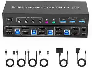 HDMI Displayport KVM Switch 2 Monitors 4 Computers 4K60Hz Dual Monitor KVM Support 4 USB3.0 Ports Sharing Keyboard and Mouse Printer Scanner with Controller
