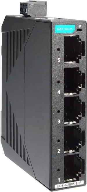 Moxa EDS-G2005-ELP , 5-Port Full Gigabit Entry-Level Unmanaged Switch with 5 10/100/1000 BaseT(X) Ports, 12/24/48 Power Input, Plastic housing, -10 to 60°C Operating Temperature