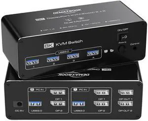 DEMEXBOOK 8K Dual Monitor DisplayPort KVM Switch 2 Monitors 2 Computers 8K@60Hz 4K@144Hz, 2 Computers Share 2 Monitors, 4 USB 3.0 Ports, Supports Extended/Copy Mode with Remote & USB Cables