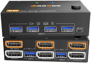 Dual Monitor KVM Switch 2 Port 8K@30Hz 4K@144Hz Displayport USB 3.0 Switch Extended Display 2 Monitors 2 Computers with USB 3.0 Cables Wired Controller