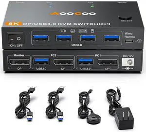 HDMI Displayport KVM Switch 3 Monitors 4 PC 8K@60Hz/4K@144Hz KVM Switches with USB 3.0 Port,Wired Remote,Power Adapter and USB3.0 Cables Included