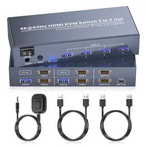 Dual Monitor HDMI KVM Switch 2 Monitors 2 Computers, 4K60Hz and 4 USB 3.0, Control 2 PCs with 2 Monitors and 1 Set of Keyboard Mouse