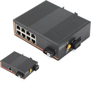 Industrial Network Switch Gigabit Ethernet Media Converter, Plug & Play, IP40, Din Rail Mount, 1SC to 8RJ45 A Side with 1SC to 1RJ45 B Side, Single Mode 20KM