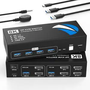 8K@60Hz KVM Switch 2 Monitors 2 Computers Display Port, KVM Switches Dual Monitor with 4 USB 3.0 Ports Sharing Keyboard Mouse Printer, Computer Switch for 2 Computers, Displayport Switch 2 in 2 Out