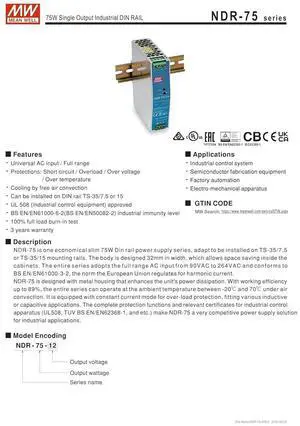 Mean Well NDR-75-12 75.6W Single Output Industrial DIN Rail NDR-75 12V 6.3A