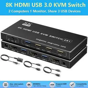 Vszerda 8K 60Hz HDMI 2.1 Switch 3x1 4K 120Hz 48Gbps,HDCP 2.3,VRR, HDR ,HDMI Switcher 3 in 1 Out,3 Port HDMI Selector,IR Remote,for QLED TV,PS5,Xbox,Fire Stick,Roku,Blu Ray,Projector