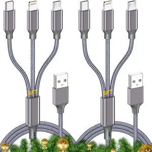 Multi Charging Cable(2Pack 4FT) 3 in 1 USB Charging Cable for Multiple Devices Braided Universal Phone Charger Cord with Type-C Micro USB IP Port for iPhone17/16/14/Android Phones and More