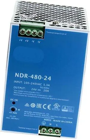 NDR-480-24 24V 20A 480W DIN Rail Industrial Power Supply with Active PFC, 90-264VAC Input, Short Circuit/Overload Protection for Automation Systems