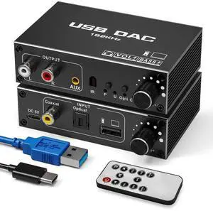 USB Audio Converter,192KHz DAC Digital to Analog Converter with Volume Control,Bass Adjustment,Remote Control,USB Optical SPDIF Coaxial to Analog Stereo RCA L/R and 3.5mm Jack Audio Adapter