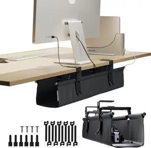 Original No Drill Under Desk Cable Management Tray 27.3" - Premium Black Fabric Cable Management Under Desk - Clamp/Screw Mount Cord Organizer - Supports Upto 66lbs