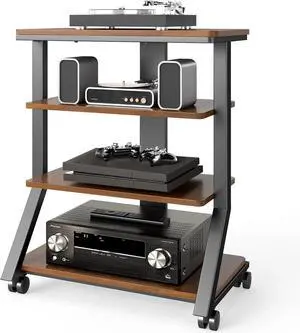 4-Tier AV Media Stand with Wheels, Mobile Rack Audio Tower with Height Adjust Shelves, Wooden Stereo Racks and Stands, Stereo Stand for Record Player, TV Box, Corner Entertainment Center