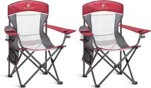 2PC Oversized Mesh Back Camping Folding Chair Heavy Duty Support 350 LBS Collapsible Steel Frame Quad Chair Padded Arm Chair with Cup Holder Portable for Outdoor (Red-2PC)