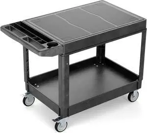 Utility Service Cart, 2 Shelf 550LBS Heavy Duty Plastic Rolling Utility Cart with 360° Swivel Wheels (2 with Brakes), Large Lipped Shelf, Ergonomic Storage Handle for Warehouse/Garage/Cleaning