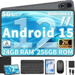 12 Inch Tablet Android 15 Tablets, 2025 Upgraded Android Tablet with Keyboard, 24GB RAM+256GB ROM(1TB Expand), Octa-Core, 2K 2000x1200 Display, 16MP Dual Camera, 8000mAh, 2.4G/5G WiFi, GPS (Black)