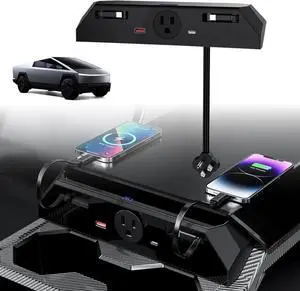 USB Charger Hub for Tesla Cybetruck with 110V AC Outlet & Retractable Cables - Seamless Integration, 30W PD/QC3.0 Fast Phone Charge, Center Console Docking Station Accessories