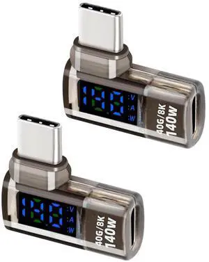JAENFONG 90 Degrees 140W USB C Male to USB C Female Adapter,USB Type C Converter,40 Gbps Data Transmission,Wattage,Voltage,Current LED Display,Suitable for Laptops,Desktop Computers,Phone (2Pcak)