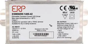 ESM060W-1400-42 CC LED Power Supply 120-277 Vac, 87% eff, Rectangular Metal Case, Forward/Reverse Phase & 0-10V dimming, 1-100% dim Range, 58.8 W max, 1400 mA Iout, 24-42 Vout