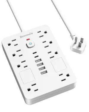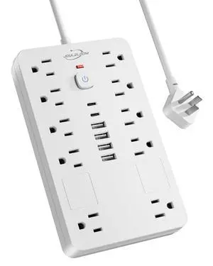 15 FT Flat Plug Surge Protector Power Strip,11 Multiple AC Outlets with 6 USB Ports (2 USB C), 15 Feet Extension Cord, 1250W/10A, One Touch Switch Button, White