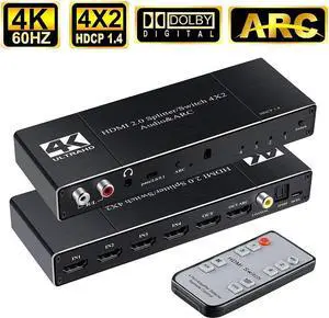 IXJYLCPC HDMI Switch 4x2 with Audio Extractor 4K@60Hz Ultra HD HDMI Switcher with Optical TOSLINK SPDIF, R/L 3.5mm Audio, Coaxial Support ARC Function HDCP 2.2 YUV4:2:0,EDID,HDR Remote Control