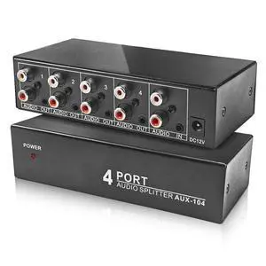 3.5mm Aux + RCA L/R Audio Splitter 1 in 4 Out, 4-Way Stereo Audio Distributor Box 4-Channel Stereo RCA Splitter 1x4 for DVD Player, Game Console, Headphones, Speaker - w/Power