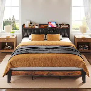 LIKIMIO California King Bed Frame, Storage Headboard with Charging Station, Solid and Stable, Noise Free, No Box Spring Needed, Easy Assembly (Vintage and Black)